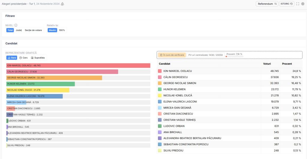 O zi nemaiîntâlnită urmată de o noapte de șoc pe scena politică și în societatea românească. Cu aproape toate secțiile numărate, candidatul cu simpatii recunoscut putiniste și legionare Călin Georgescu este pe primul loc în rezultatele parțiale publicate de AEP. Georgescu are peste 2,1 milioane de voturi și un avans detașat, de aproape 350.000 de voturi în fața următorului candidat. Pentru locul doi, care asigură prezența în turul doi al alegerilor prezidențiale, Elena Lasconi îl conduce pe Marcel Ciolacu la o diferență mică, de câteva mii de voturi, după ce a recuperat decalajul față de liderul PSD pe tot parcursul nopții.