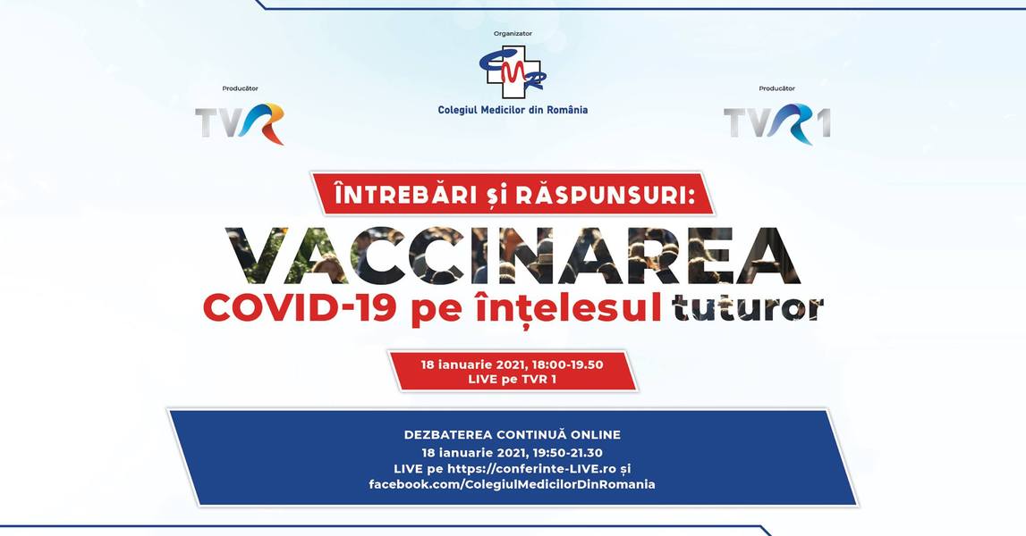 12 dintre cei mai cunoscuți medici din România răspund la cele mai importante întrebări despre vaccinarea împotriva COVID-19 în cadrul conferinței „Întrebări și Răspunsuri: Vaccinarea COVID-19 pe înțelesul tuturor”, organizată de Colegiul Medicilor și transmisă LIVE de TVR și HotNews.ro începând cu ora 18:00. Daniel Coriu, președintele Colegiului Medicilor, Andreea Moldovan, medic epidemiolog și secretar de stat în Ministerul Sănătății, Beatrice Mahler, medic pneumolog și managerul Institului Marius Nasta și Valeriu Gheorghiță, coordonatorul campaniei naționale de vaccinare, sunt câțiva dintre medicii care vor răspunde la întrebările despre vaccin.