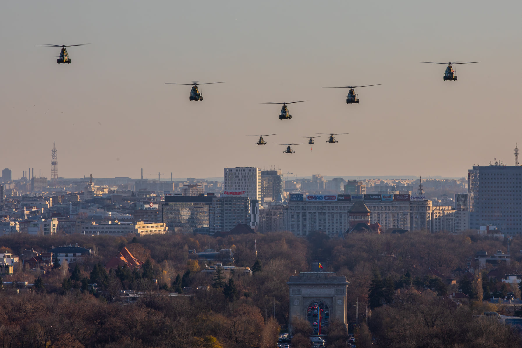 Piața Arcului de Triumf va fi survolată de formații de elicoptere. Acestea aparțin Ministerului Apărării Naţionale, Ministerului Afacerilor Interne și Serviciului Român de Informaţii.