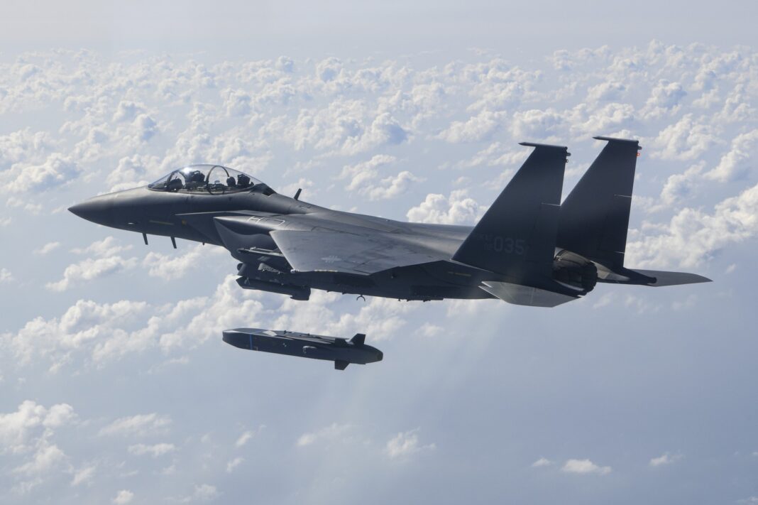 Avioane F-15K ale Forțelor Aeriene ale Coreei de Sud participă la un test de tragere reală, cu rachete TAURUS, de fabricație germană, care au zburat 400 de kilometri și au lovit cu succes ținte prestabilite în Marea Galbenă. 10 octombrie 2024.