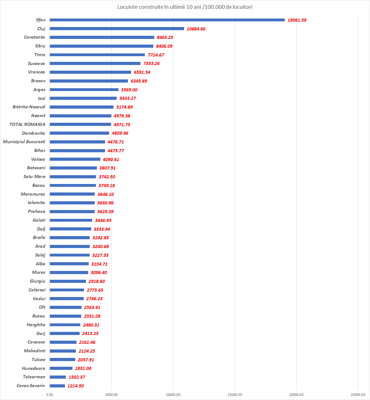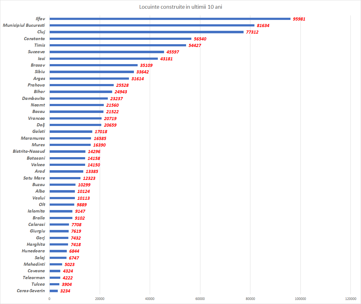 Sigur că numărul de locuințe construite depinde și de populția din fiecare județ. Dacă ne uităm la locuințele nou construite în ultimii 10 ani, la suta de mii de locuitori, clasamentul se schimbă .