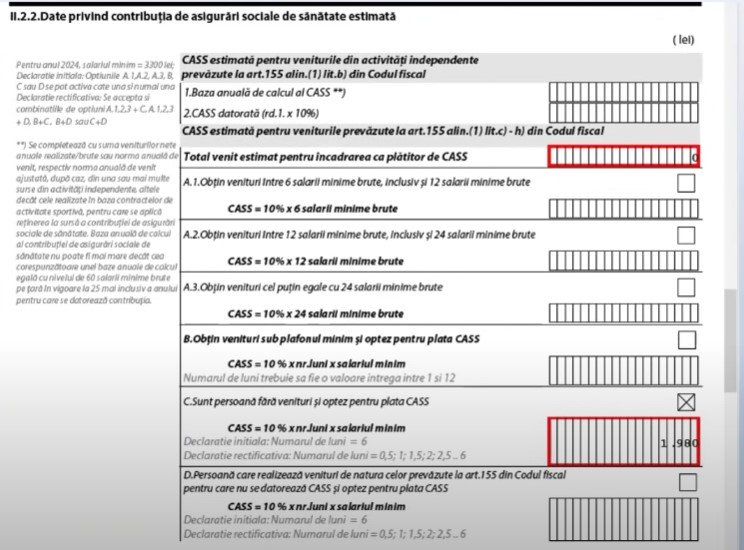 Acolo, pe lângă datele personale trebuie să bifeze căsuța II.2.2, adică numai pentru CASS. Ulterior, la venitul estimat trebuie pusă cifra 0 (zero). Apoi trebuie bifată secțiunea C: sunt persoană fără venituri și optez pentru plata CASS. Acolo veți completa suma de 1.980 lei (vezi FOTO).