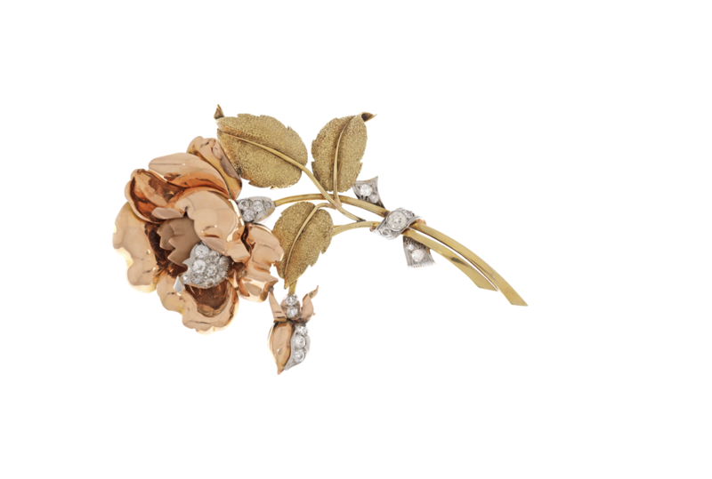 Ziua de miercuri prilejuiește accesul online la zeci de bijuterii prețioase de lux, cu prețuri destinate oricărui buget, de la 100 până la 25.000 de euro. O apariție de epocă este excepționala broșă-pandantiv din aur roșu, ornată cu trei diamante, cca. 1900. Aflată în cutia originală, piesa are prețul curent de 700 de euro. O altă piesă de rezistență, realizată câteva decenii mai târziu, este broșa în forma unui trandafir, din aur bicolor și platină, decorată cu diamante, cca. 1960.