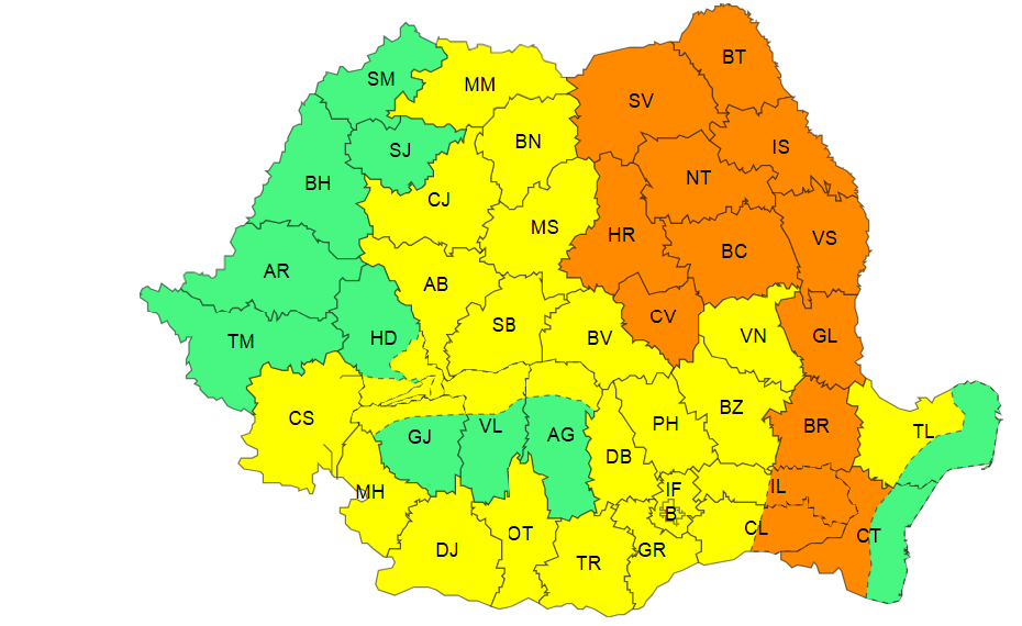 Codul galben vizează Muntenia, Dobrogea continentală, Moldova, Transilvania, sudul Banatului și Maramureș, precum și cea mai mare parte a zonei montane.