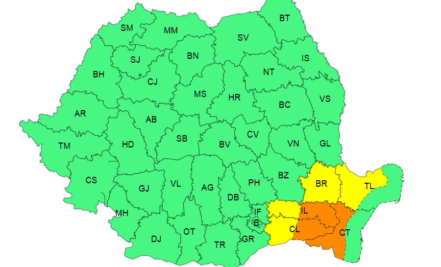 Astăzi, până la ora 21.00, sub cod portocaliu de caniculă se află Ialomița și Călărași și vestul județului Constanța. Aici, valul de căldură se va menține, va fi caniculă, disconfort termic accentuat, iar temperaturile maxime se vor încadra între 36 și 38 de grade.