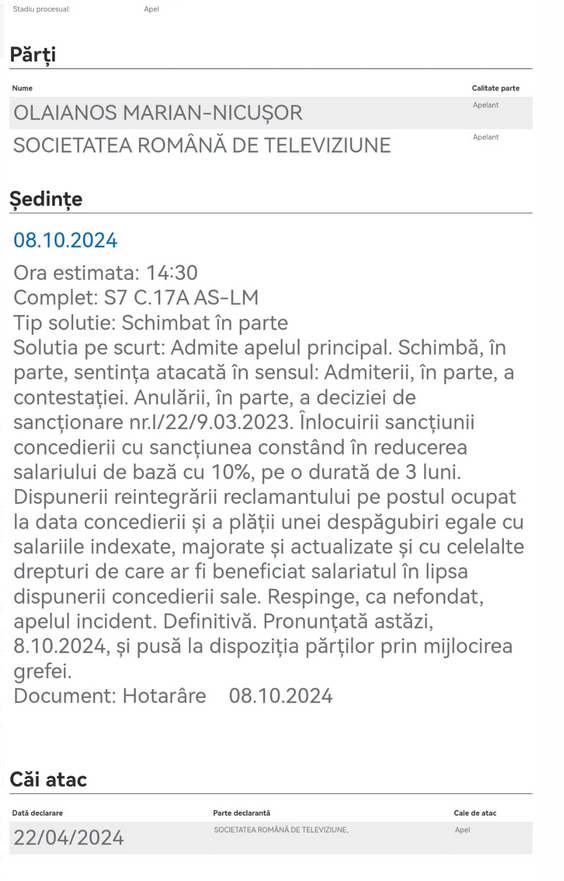Astfel, potrivit deciziei Curții de Apel București, TVR este obligat să îl reintegreze pe Marian Olaianos în funcţia şi postul deţinute anterior. Sancțiunea inițială a concedierii a fost înlocuită cu „sancțiunea constând în reducerea salariului de bază cu 10%, pe o durată de 3 luni”.