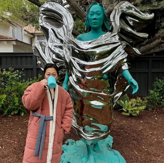 În fotografie, adevărata doamnă Chan este surprinsă în timp ce bea dintr-o cană în aceeaşi culoare albastru deschis ca a statuii. Ea a comentat la dezvăluirea operei de artă de către soţul ei pe Instagram, spunând: „Cu cât mai mult din mine, cu atât mai bine?”, împreună cu un emoji în formă de inimă.