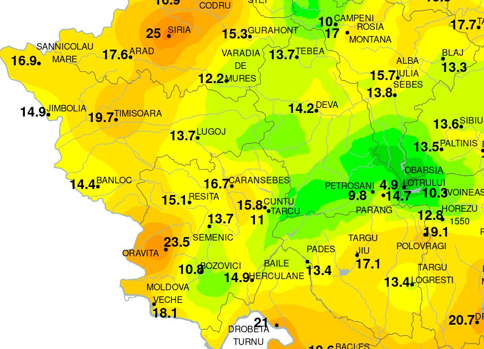 Marți dimineață în România au fost multe zone cu temperaturi de sub 10 grade C, dar și stații meteo cu temperaturi minime de peste 23 C. Cele mai mari au fost în Crișana, Banat și Moldova, iar cel mai cald a fost în județul Arad: minimă de 25 C, arată datele ANM. Urmează zile foarte calde în țară, cu maxime ce vor atinge 37 C în sud.