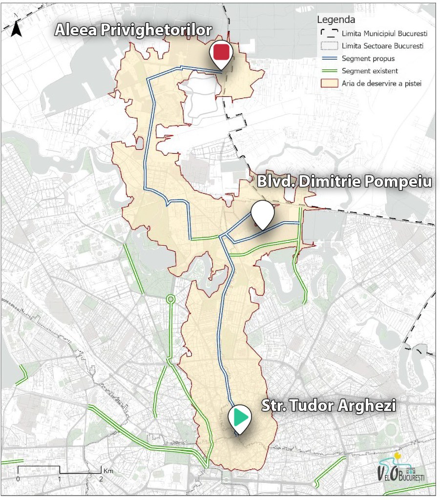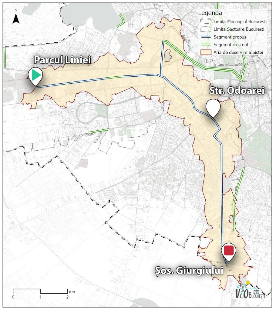 Traseul propus este alcătuit din următoarele străzi: Strada/Parcul Liniei, Bulevardul Geniului, Șoseaua Grozăvești, Șoseaua Panduri, Bulevardul Tudor Vladimirescu, Strada Odoarei, Șoseaua Viilor, Strada Spătarul Preda, Strada Progresului. Valoarea estimativă pentru realizarea pistei de biciclete: 6,72 milioane euro.