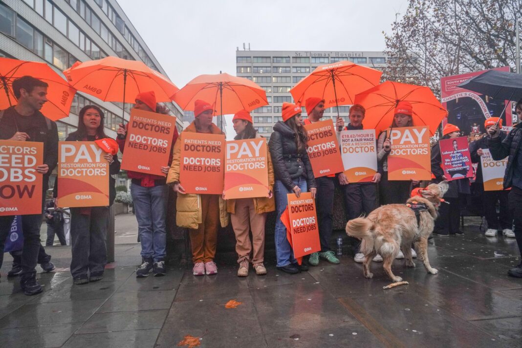 Medicii rezidenți prostestează în ploaie în fața spitalului St Thomas din Westminster, în cadrul unei greve de cinci zile în Anglia, pe 14 noiembrie 2025.