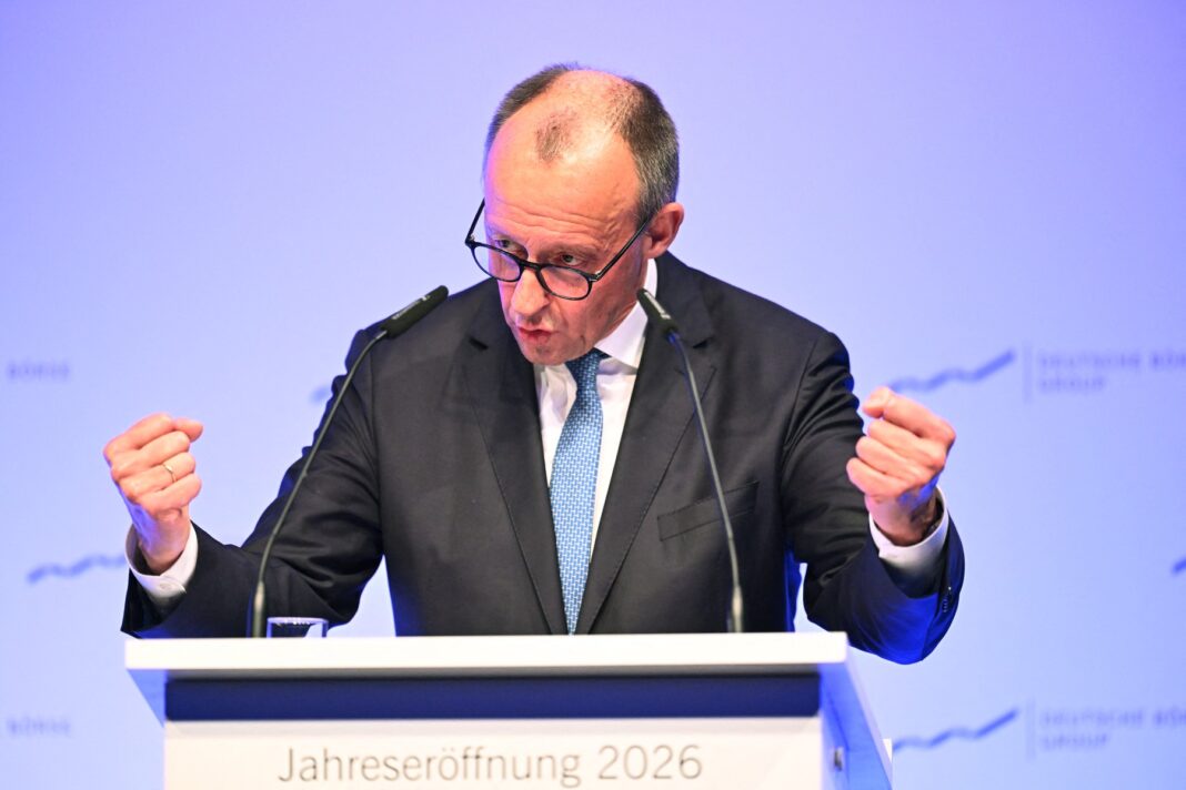 Cancelarul german Friedrich Merz în timp ce ține un discurs la recepția anuală a operatorului bursier Deutsche Boerse, în Eschborn, vestul Germaniei, pe 2 februarie 2026.