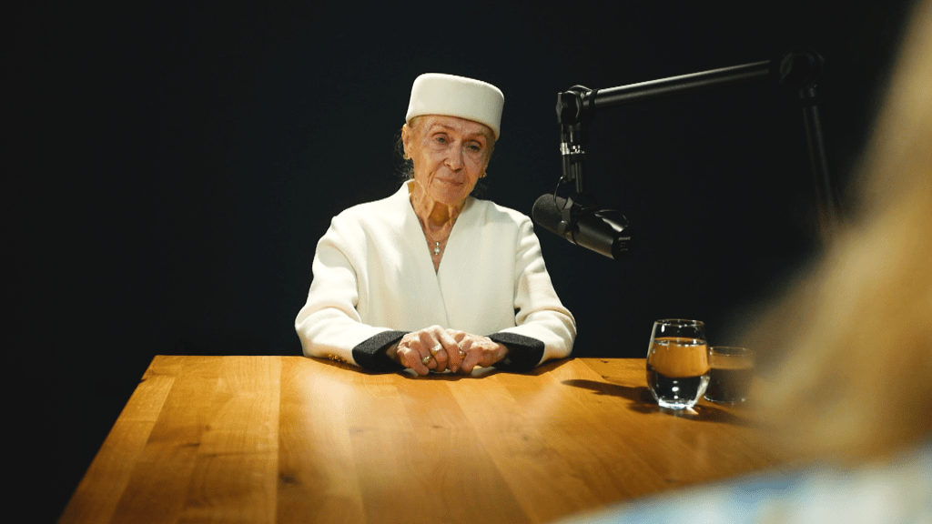 Când o întâlnesc, Omi poartă un costum alb, iar toca de pe cap îi pune perfect în valoare trăsăturile feței. Pentru că vorbim despre fashion, o întreb ce brand este ținuta.
