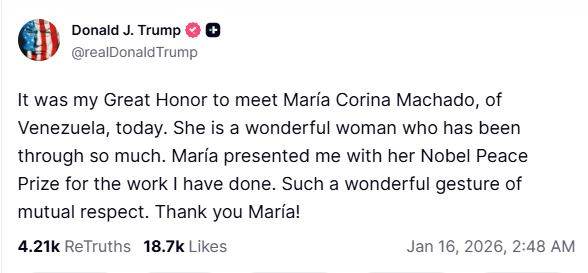 Într-o postare pe rețelele de socializare joi seara, Trump a scris: „A fost o Mare Onoare să o întâlnesc pe venezueleana Maria Corina Machado. Este o femeie extraordinară care a trecut prin multe. Maria mi-a înmânat Premiul Nobel pentru Pace pentru munca pe care am depus-o. Un gest minunat de respect reciproc. Mulțumesc, Maria!”.