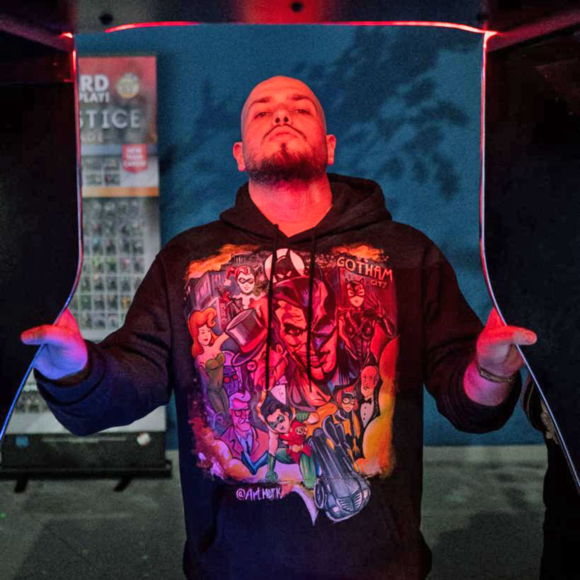 Hanorac pictat manual, cu supereroi din benzi desenate celebre, unicat, donat de BROmania (vloggerul Matei Dima)