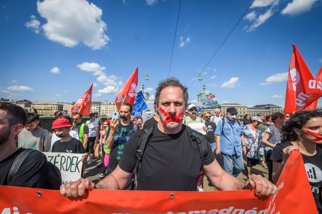 Mulți protestatari au purtat un căluș în gură la mitingul de pe Podul Libertății din capitala Ungariei și au afișat pancarte care cereau retragerea proiectului de lege.