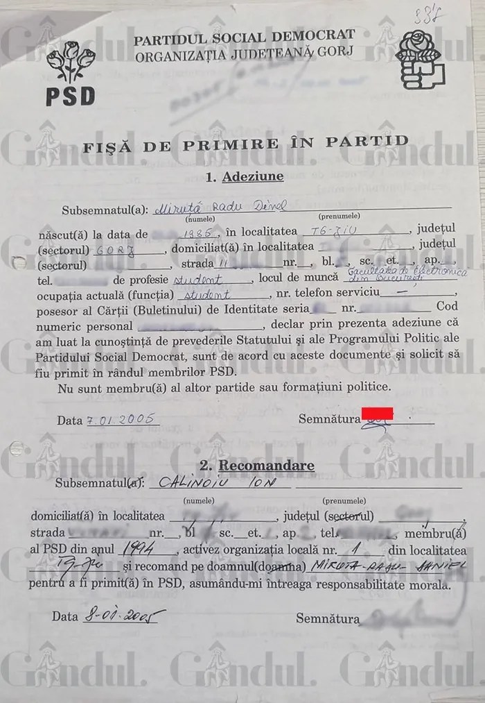 Publicația Gândul a publicat marți seara un document, intitulat „fișă de primire în partid”, despre care scrie că a fost semnat de actualul ministru USR al Apărării, care este și vicepremier, Radu Miruță. Într-o reacție publică pe Facebook Radu Miruță spune că datele din document îi aparțin, dar că în realitate nu a făcut niciodată parte din partidul condus acum de Sorin Grindeanu.