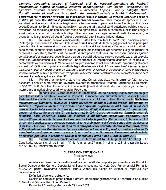 În concluzie, Curtea constată că, întemeindu-se pe dispoziții legale care nu asigură garanțiile de independență ale Avocatului Poporului în raport cu alte autorități publice, dispoziții cărora Parlamentul le-a atribuit o altă interpretare decât cea care rezultă din conținutul lor normativ, Hotărârea Parlamentului României nr.36/2021 pentru revocarea doamnei Renate Weber din funcția de Avocat al Poporului încalcă dispoziţiile constituţionale cuprinse în art.1 alin.(3) și (5) care consacră principiul statului de drept și principiul legalităţii şi al supremaţiei Legii fundamentale, precum și dispozițiile art.9 alin.(2) din Legea nr.35/1997.