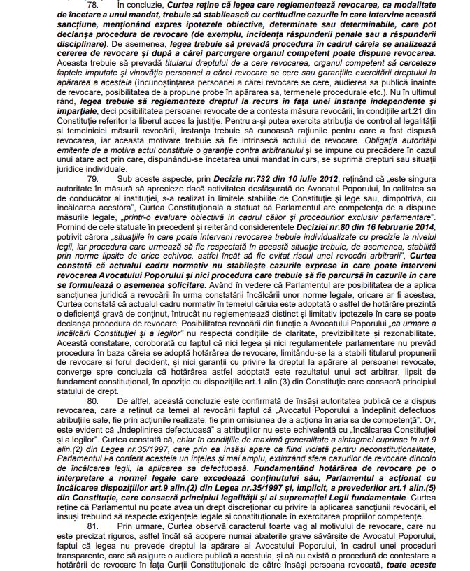 - Curtea constată că actualul cadru normativ nu stabilește cazurile exprese în care poate interveni revocarea Avocatului Poporului și nici procedura care trebuie să fie parcursă în cazurile în care se formulează o asemenea solicitare
