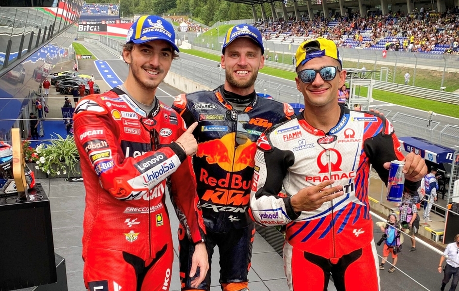 Bagnaia a trecut al doilea linia de sosire, urmat de spaniolul Jorge Martin (Ducati Pramac), plecat din pole position. Atât Bagnaia, cât şi Martin au încheiat Marele Premiu austriac cu pneuri de ploaie.