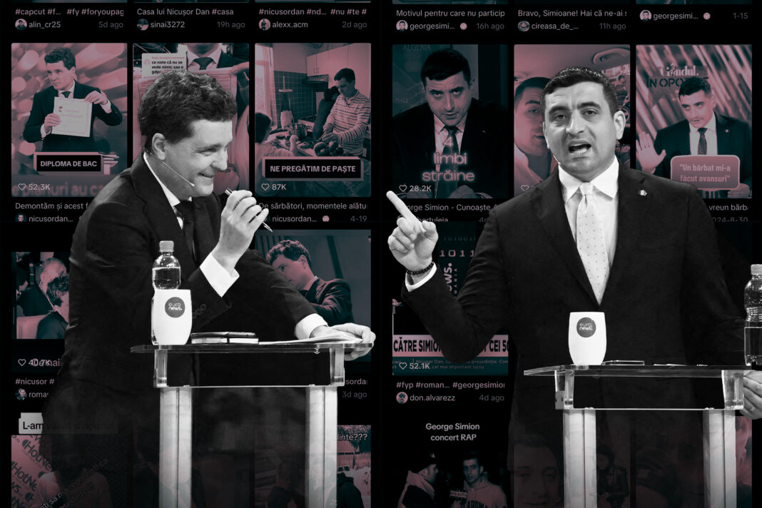 Telefonul filmează un grup de oameni care sărbătoresc că vor vota pentru George Simion. „Ești de-al nostru, Simioane”, îi strigă ei. Ecranul se împarte în două și un influencer îi arată cu degetul, insistând pe ideea că Simion e urmat de către cei din etnia lui: ”***nii, ***nii!”. Imediat apare un alt videoclip scurt, cu Nicușor Dan vopsit pe față în roz și căruia un soft i-a adăugat o fustiță scurtă. Un alt influencer, de data asta al lui Simion, îi blestemă de Dan și pe susținătorii săi: „Niște c***. Ei ne vor schimba sexul copiilor”.