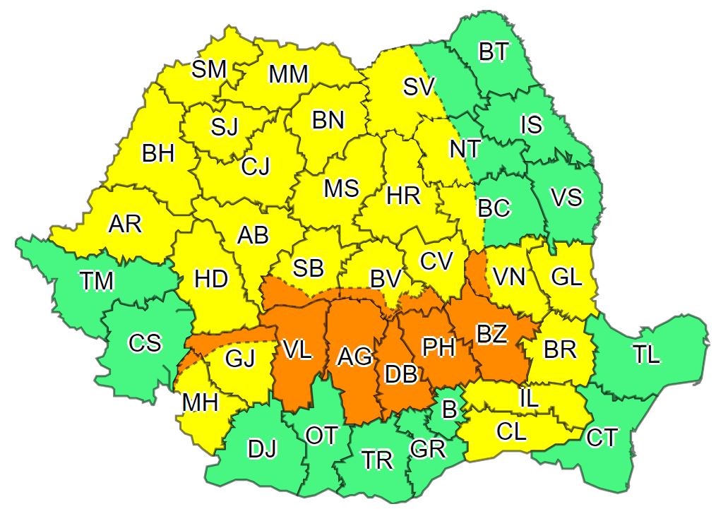 În zona Carpaților Meridionali și de Curbură, precum și în jumătatea nordică a Munteniei și în nord-estul Olteniei vor fi perioade cu instabilitate atmosferică deosebit de accentuată.