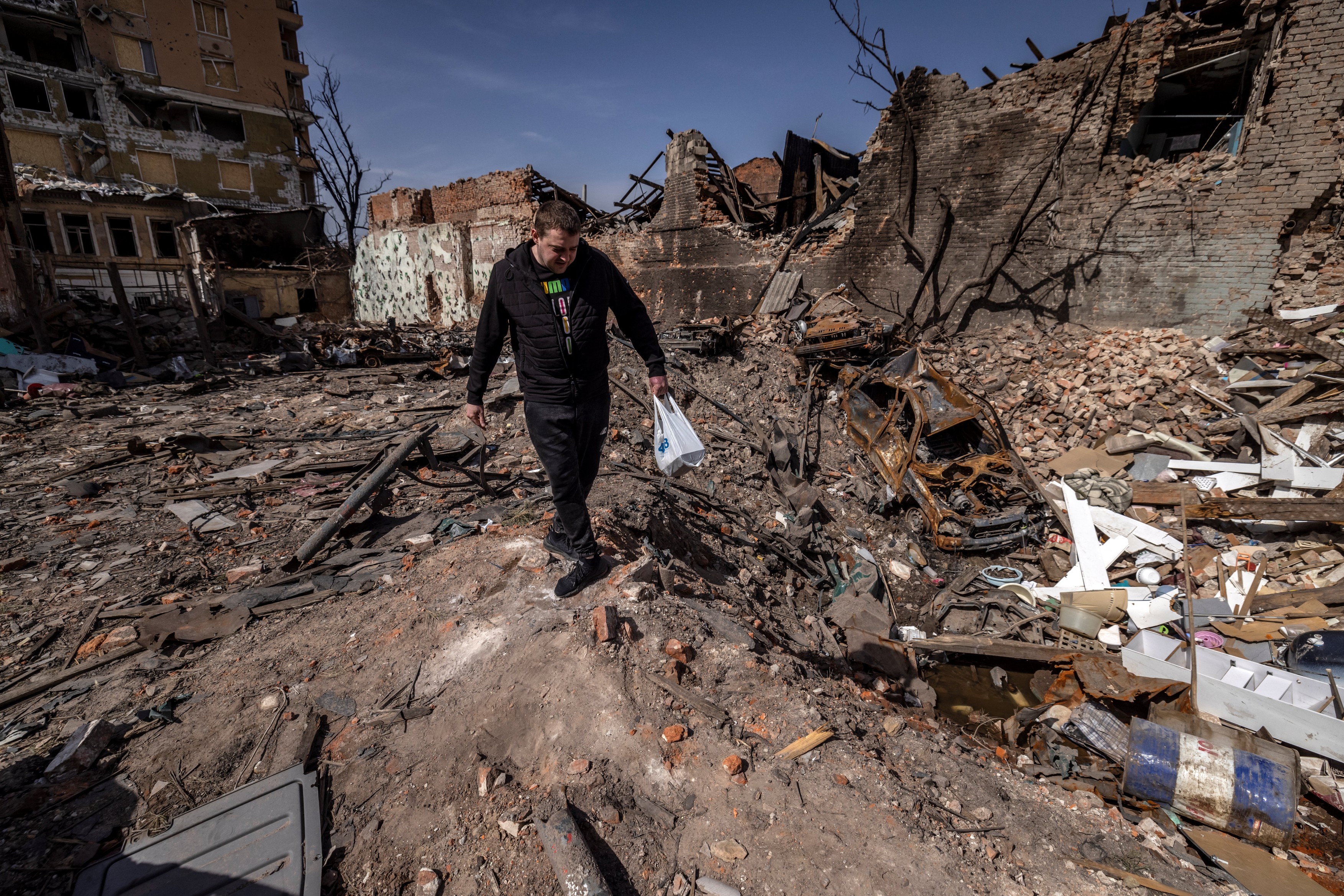 Un barbat merge pe o strada distrusa de bombardamentele rusesti in HarkivFoto: FADEL SENNA / AFP / Profimedia Images
