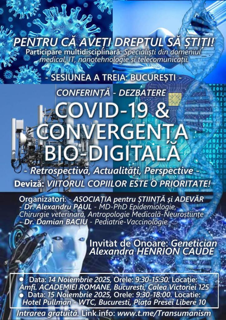 Organizatorii conferinței „COVID-19 și convergența bio-digitală”, care a stârnit controverse după ce a avut loc și în luna septembrie, la Brașov, urmau să organizeze o nouă ediție a conferinței pseudoștiințifice pe 14 noiembrie, în amfiteatrul Academiei Române. Într-un dialog cu HotNews, președintele Academiei Române, Ioan Aurel Pop, spune că a oprit joi organizarea acestei conferințe într-un spațiu al instituției, „de îndată ce am aflat despre ce este vorba”. Ministerul Sănătății reacționează și spune că a făcut plângere la parchet pentru organizatorii conferinței.