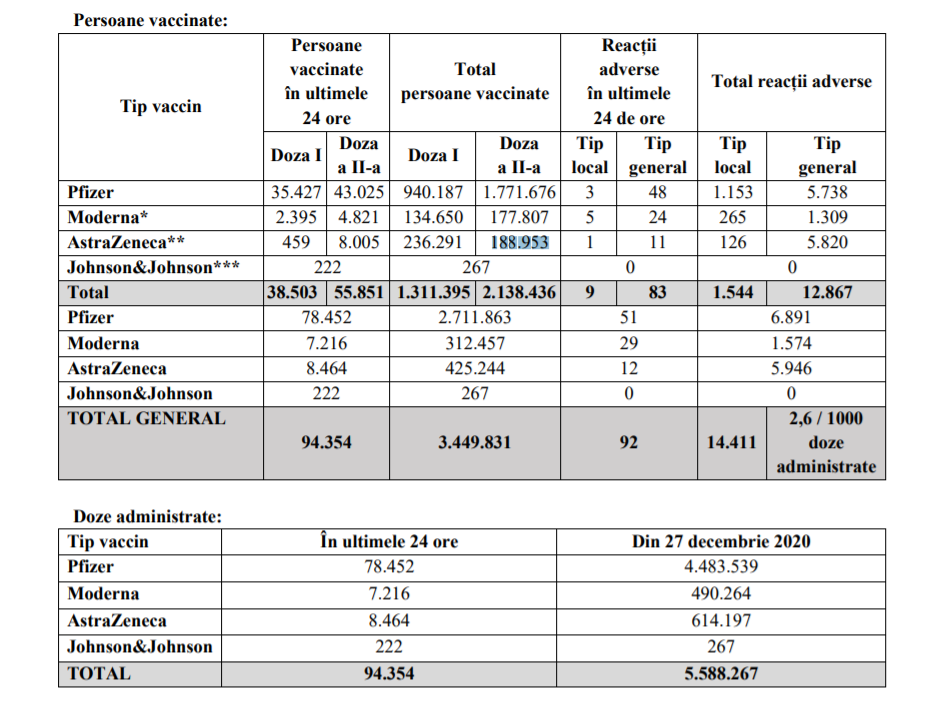 3.449.831 de persoane au fost imunizate cu una sau două doze de la debutul campaniei de vaccinare, dintre care 2.138.436 cu ambele doze.