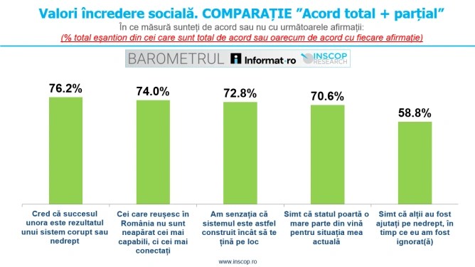 54.5% dintre participanții la sondaj sunt total de acord cu afirmația ”Cred că succesul unora este rezultatul unui sistem corupt sau nedrept”, 21.7% sunt oarecum de acord, 5.5% oarecum în dezacord, iar 15.2% în total dezacord. Ponderea non-răspunsurilor este de 3.1% din total eșantion.