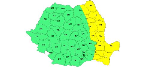 În Moldova, Dobrogea și estul Munteniei, temporar vântul va avea intensificări, cu rafale de 50…70 km/h.