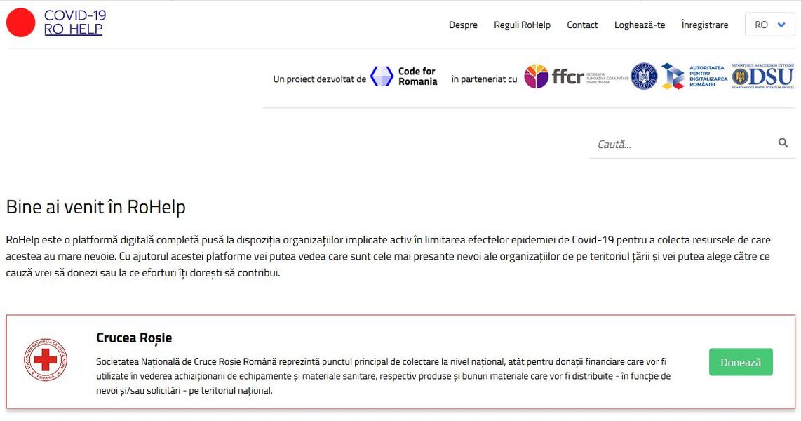 RoHelp.ro, o nouă platformă digitală, susținută de Guvern, a fost lansată marți pentru a permite ONG-urilor implicate activ în limitarea efectelor epidemiei de Covid-19 pentru a colecta resurselor de care au nevoie. Platforma a fost dezvoltată în mod gratuit de voluntarii Code for Romania Task Force și 28 de ONG-uri adună deja donații prin această nouă soluție digitală, se arată în comunicatul de presă.