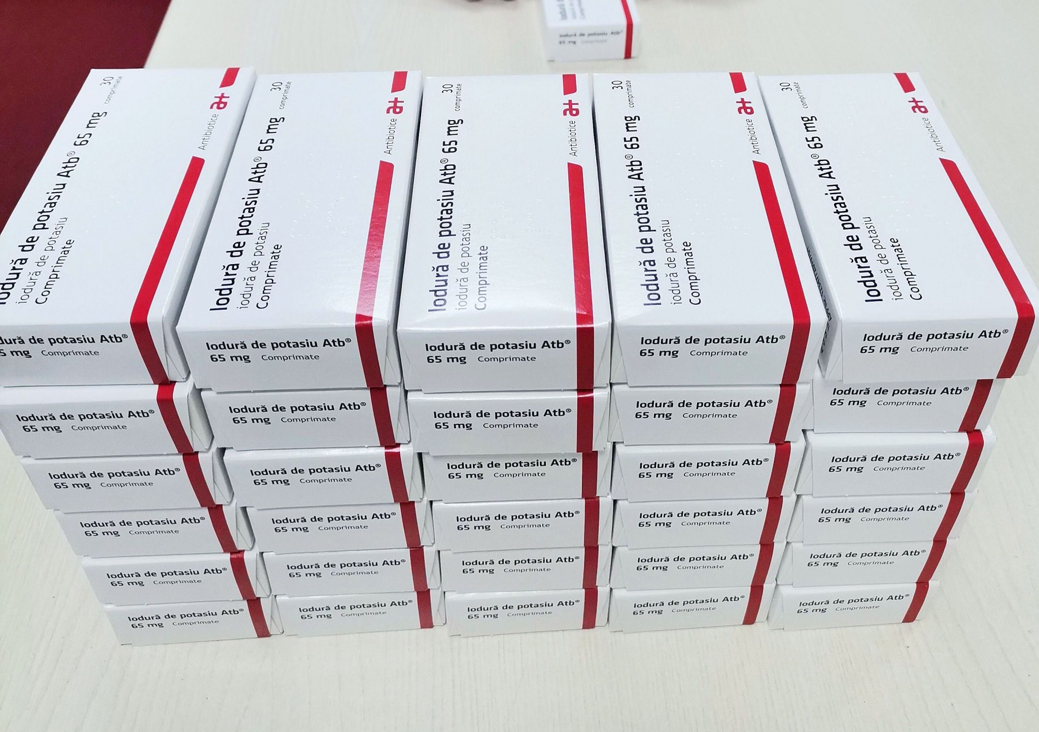 Antibiotice Iași a început, luni, distribuția celor 30 de milioane de tablete de iodură de potasiu 65 mg produsă de urgență către Direcțiile de Sănătate Publică din toată țara. Până pe 28 martie, toate cele 30 de milioane de tablete de de iodură de potasiu vor ajunge în depozitele DSP-urilor.