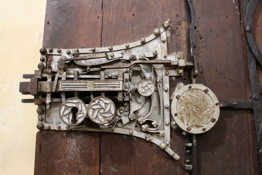 Uşa a fost confecţionată din scânduri groase de stejar de meşterul Johannes Reichmuth din Sighişoara, la 1515, pe ea fiind montată o încuietoare metalică ce era acţionată prin intermediul unei manivele şi a unei chei. Practic, uşa are 19 zăvoare metalice dispuse împrejur, toate fiind conectate între ele.
