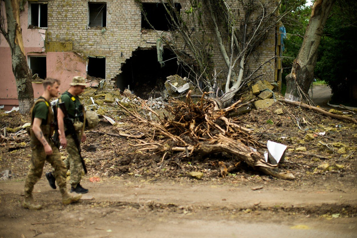 Soldați ucraineni lângă o clădire distrusă de bombardamente la BahmutFoto: Francisco Seco / AP – The Associated Press / Profimedia