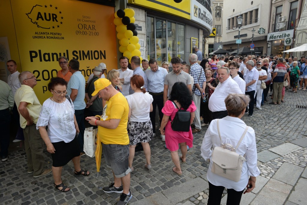 Sute de oameni, mulți de vârsta a treia, s-au înșirat la coadă la AUR, să semneze „contract” cu viitorul președinte al României, George Simion. Și-au dat în scris, sub semnătură, datele personale, de la CNP la număr de mobil, în schimbul iluziei că vor avea acces la apartamente ieftine, pornind de la 35.000 de euro, la rate și dobânzi infime, de 2%.