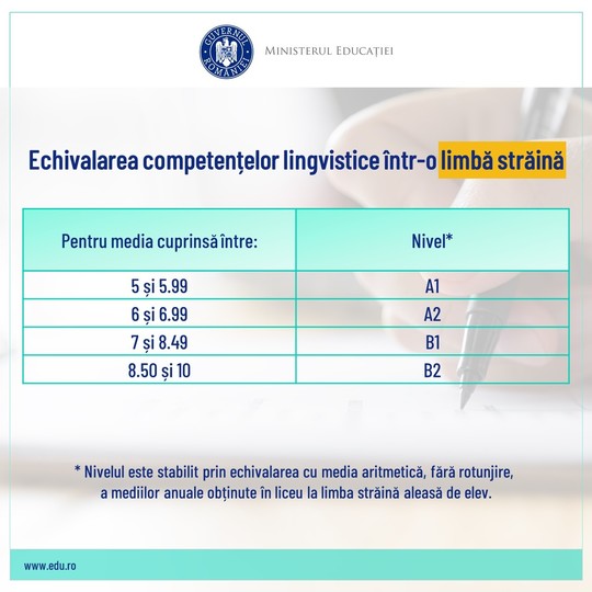 - Prin recunoașterea și echivalarea rezultatelor obținute la disciplina limba și literatura română/limba și literatura maternă, în clasele IX-XII, candidaților la examenul național de bacalaureat 2023 li se acordă următoarele niveluri de competență lingvistică de comunicare orală în limba română/în limba maternă: