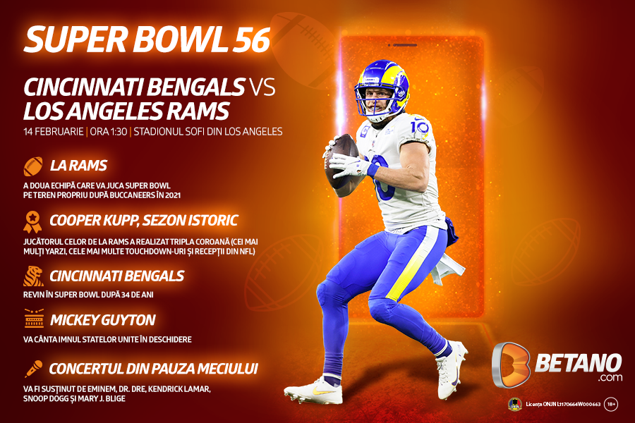 Bătălia pentru trofeul celei de-a 56-a ediții a celui mai important eveniment sportiv al anului în America va fi o luptă a surprizelor în acest an. Cincinnati Bengals și Los Angeles Rams vor încerca să pună mână pe inelele de campioni în poate cea mai inedită și neașteptată finală a ultimilor 10 ani care va fi disponibilă cu Streaming LIVE pe Betano.