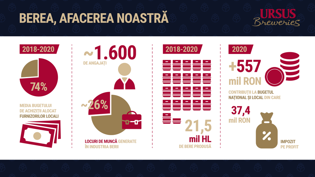 Totodată, în perioada 2018-2020, analizată în raport, investițiile Ursus Breweries se ridică la peste 50 de milioane de euro, în diverse arii, precum facilități de producție, depozite etc.