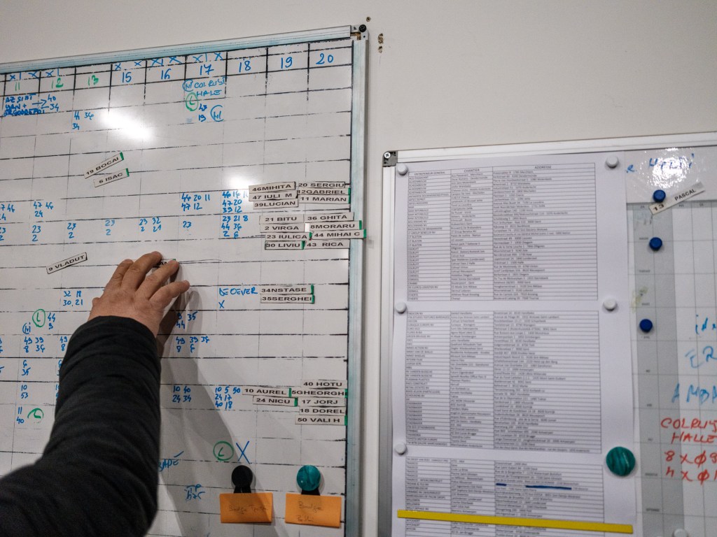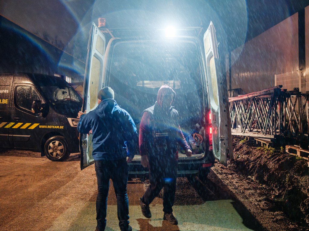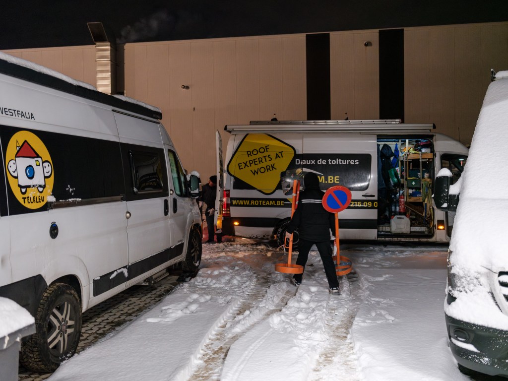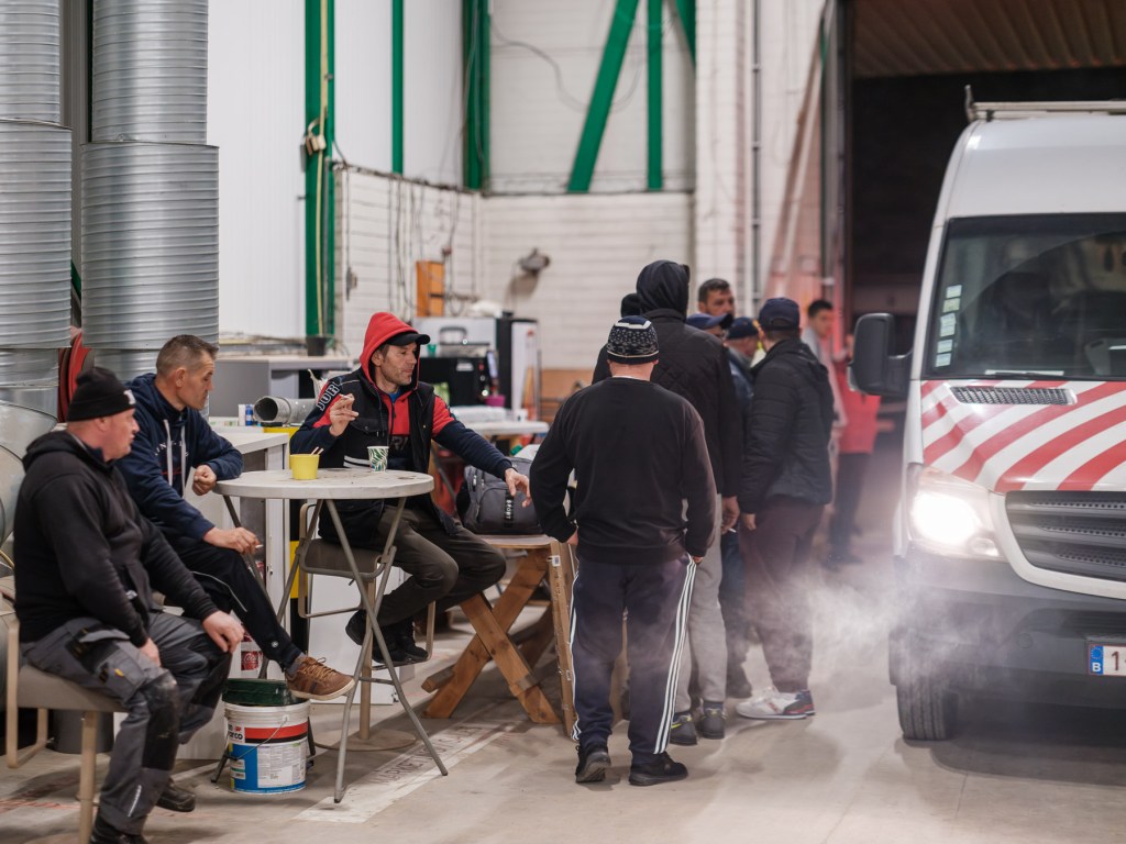 E întuneric la 5.50 dimineața, când muncitorii români vin la sediul firmei Roteam din Zaventem și încarcă dubele cu materiale și echipamente de lucru. Pe un perete din depozit sunt lipite două tabele: primul cu magneți cu numele muncitorilor și lista de șantiere, al doilea cu adresele șantierelor.