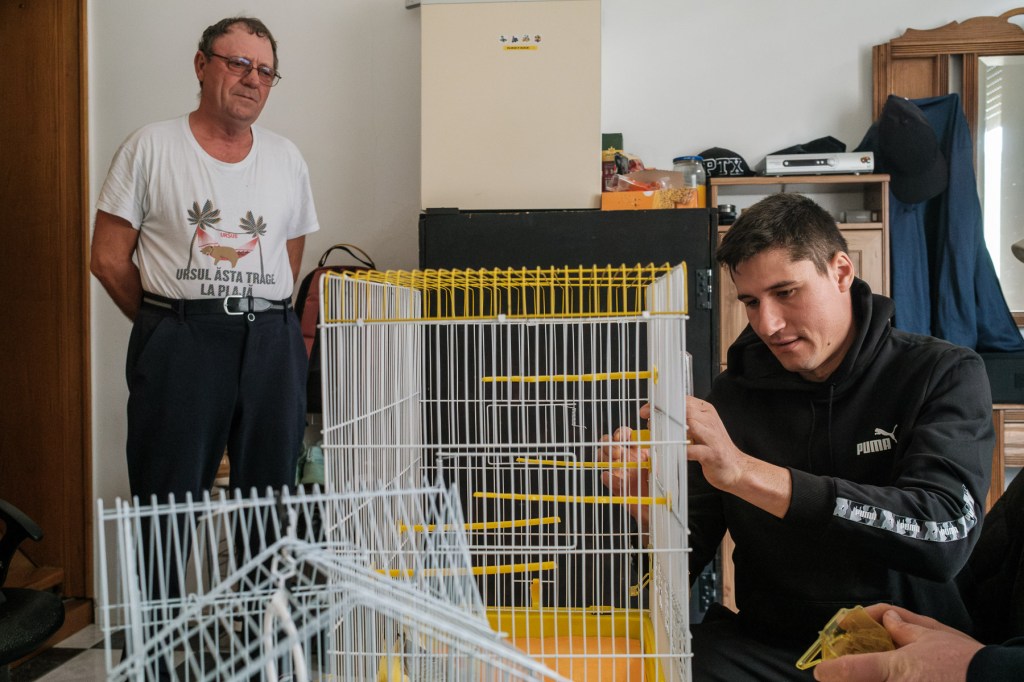 Marian a găsit azi-dimineață colivia în curte și a băgat papagalii înghețați în bucătărie, iar acum încearcă să-l convingă pe Marius că nu poate să-i lase afară, ca pe găini, mai ales că noaptea în Belgia sunt 4-5 grade Celsius. Participăm la transferul papagalilor în colivia mai mare, care se lasă cu ciupituri și pene colorate zburând prin living.