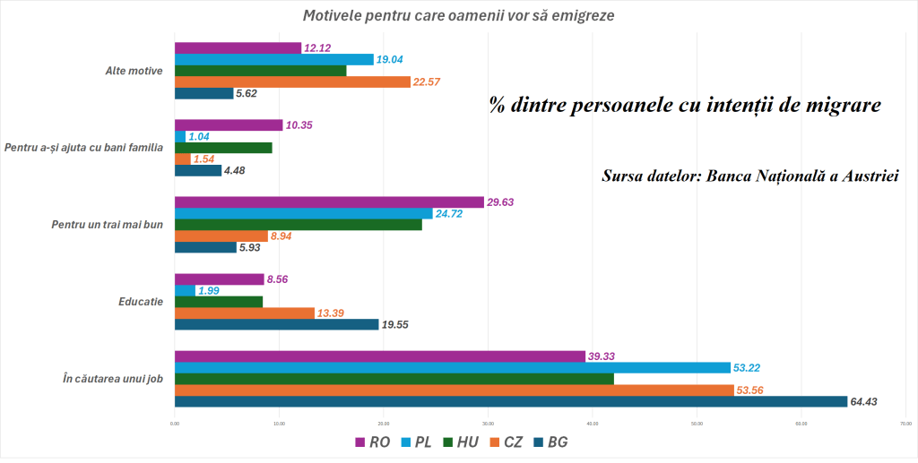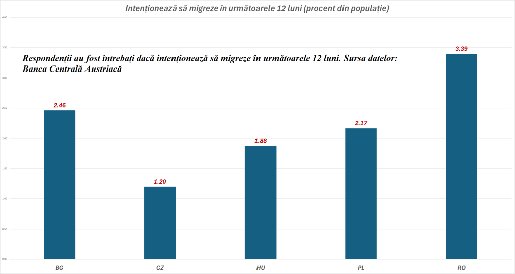 România este țara cu cea mai mare pondere din regiunea Centrală și Sud-Est Europeană a locuitorilor care declară că vor să emigreze, arată datele unui sondaj transmis HotNews de bancherii centrali austrieci. Potrivit datelor sondajului (făcut în România, Bulgaria, Cehia, Polonia, Albania, Macedonia), circa 3,4% din populația de peste 18 ani din România și-a exprimat intenția de a pleca din țară în următoarele 12 luni