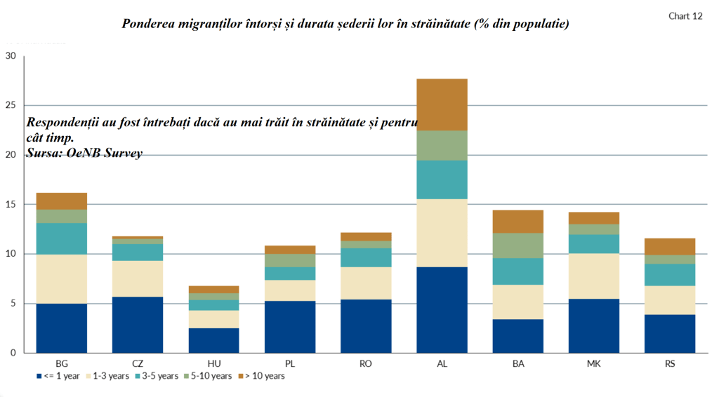 În Albania, un procent uimitor de 28% din populație declară că are au locuit anterior în străinătate. În ceea ce privește timpul petrecut în străinătate, șederile pe termen scurt perioadele de mai puțin de un an sunt frecvente. Acestea reprezintă 35% din totalul șederilor din țări, dar ponderile variază de la aproximativ 25% în Bosnia și Herțegovina până la în jur de 50% în Cehia. Cehia se remarcă ca o țară cu foarte puține persoane repatriate care au petrecut mai mult de trei ani în străinătate (aproximativ 20%). În schimb, Bosnia și Herțegovina are cei mai mulți repatriați care au petrecut mai mult de trei ani în străinătate (aproximativ 50%).