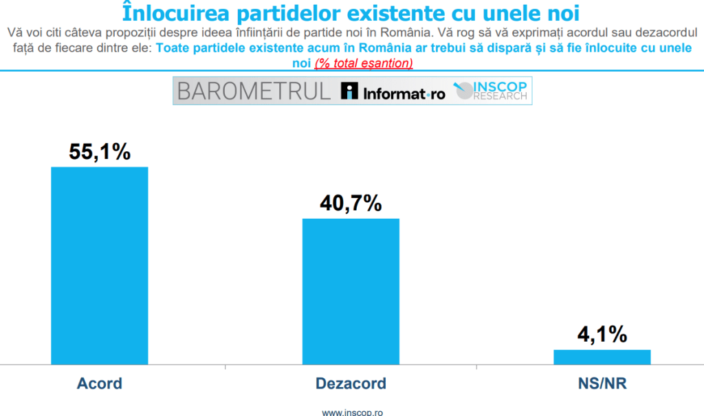 Un procent de 55% dintre români sunt de acord cu afirmația că toate partidele din țară trebuie să dispară și să fie înlocuite, potrivit unui sondaj INSCOP care a arătat și că jumătate dintre repondenți au spus că ar vota un partid nou.