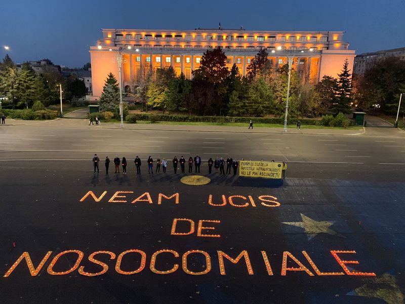 Mesajul „Neam ucis de nosocomiale” a fost scris din 500 de lumânări aprinse întinse pe asfalt, în centrul Pieţei, în faţa clădirii Guvernului.