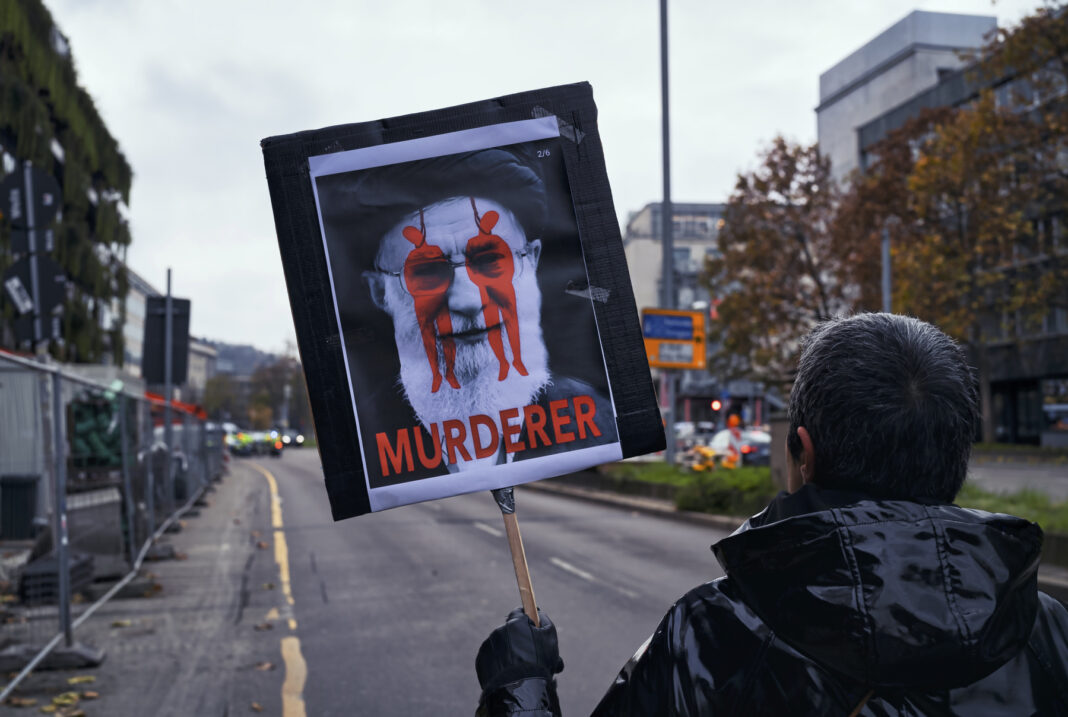 Un bărbat poartă o pancartă care îl descrie pe ayatollahul Ali Khamenei ca fiind un criminal, la o manifestație organizată la Stuttgart , FOTO: Michael Weber / imageBROKER / Profimedia