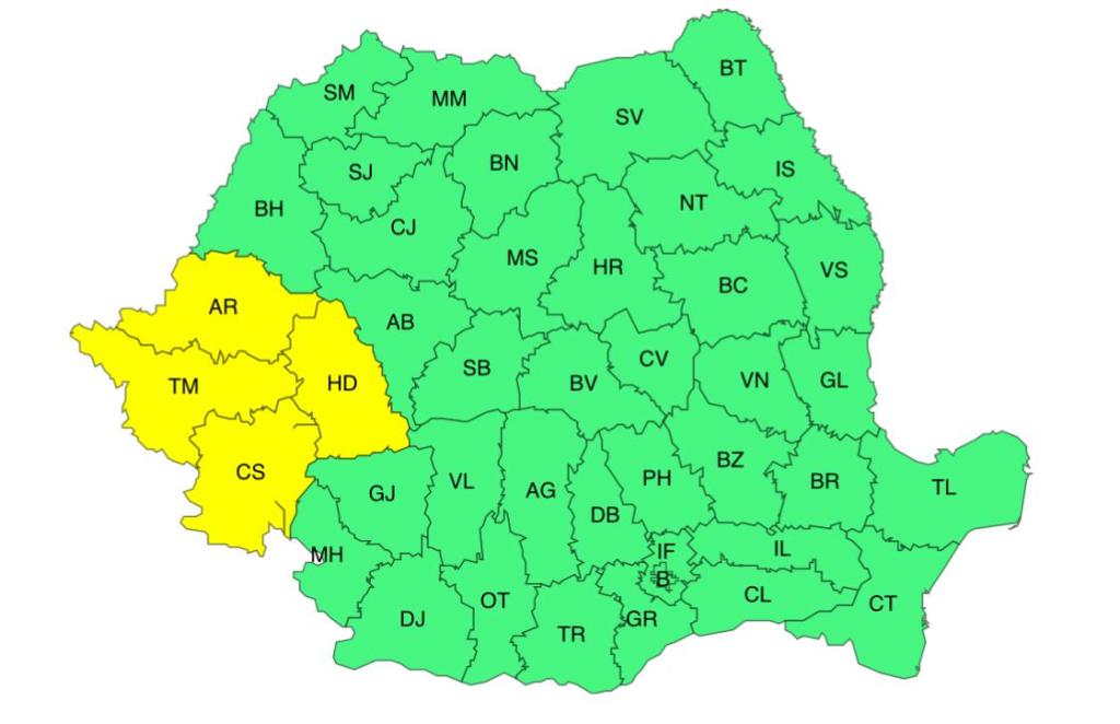 O a treia avertizare cod galben de ploi torențiale a fost emisă pentru județele Arad, Timiș, Caraș Severin și Hunedoara, pentru intervalul sâmbătă, ora 22.00, duminică, ora 22.00. În acestă perioadă, în Banat, sudul Crișanei și sud-vestul Transilvaniei va ploua însemnat cantitativ. Cantitățile de apă vor fi de 20…25 l/mp și izolat de peste 30 l/mp.