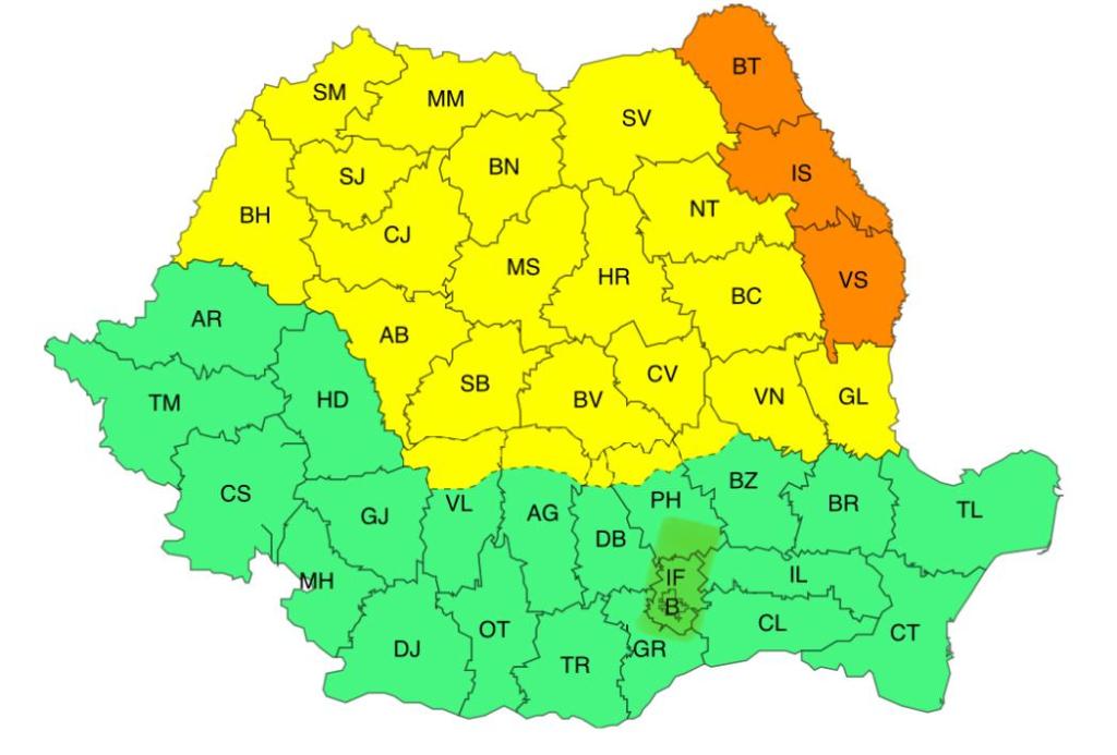 Tot de la ora 10.00, până la ora 18.00, este în vigoare o avertizare cod portocaliu de averse torenţiale pentru judeţele Botoşani, Iaşi, Vaslui. În aceste zone, în intervale scurte de timp sau prin acumulare cantitățile de apă vor fi de 40-60 l/mp și izolat de peste 70-80 l/mp, potrivit meteorologilor.