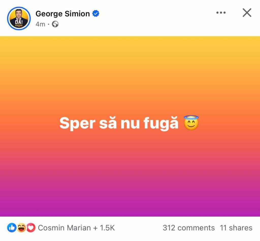 Postarea, publicată în timpul dezbaterii, conținea mesajul: „Sper să nu fugă”, făcând referire la contracandidatul său, Nicușor Dan, și avea peste 1.500 de reacții.