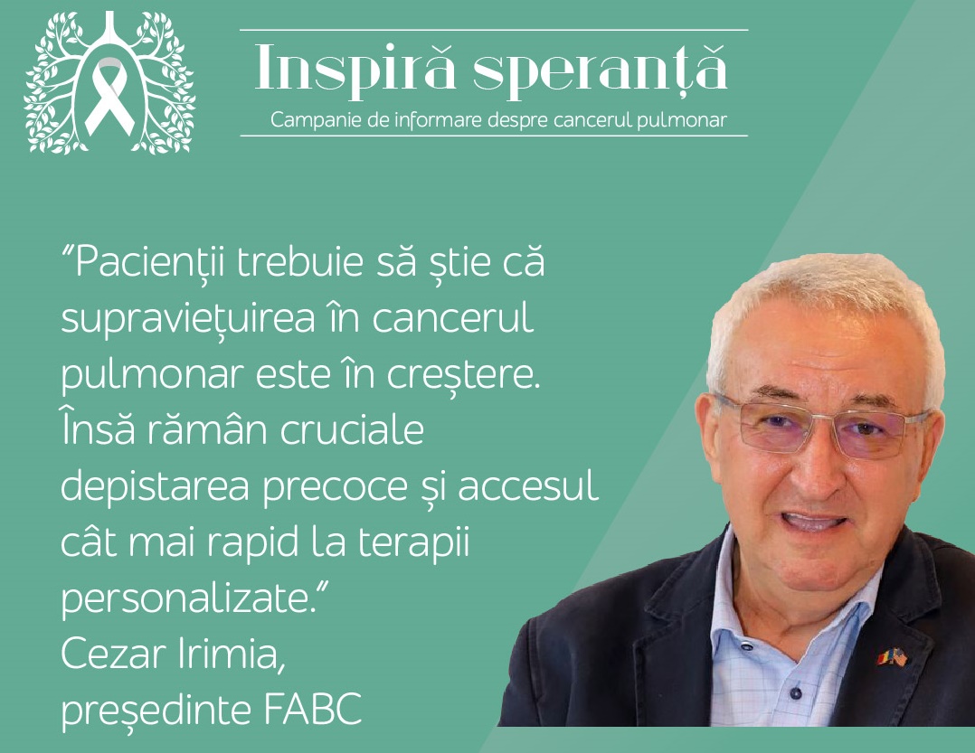 „În cancerul pulmonar, șansele de vindecare sunt cu atât mai mari cu cât este descoperit mai devreme, într-un stadiu minim de dezvoltare. Dar și în formele inoperabile de cancer pulmonar, cu metastaze, s-au făcut progrese terapeutice importante, care prelungesc viața pacientului oncologic. Deci există speranță, iar pacienții trebuie să știe că supraviețuirea în cancerul pulmonar este în creștere. Însă rămân cruciale atât depistarea precoce, prin screening, cât și accesul cât mai rapid la terapii personalizate”, spune Cezar Irimia, președintele Federației Asociațiilor Bolnavilor de Cancer din România.