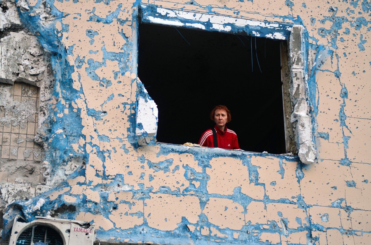 Viktor Cernatievici, un pensionar în vârstă de 75 de ani, este ajutat de 3 vecini să își măture apartamentul de la etajul 5 de cioburi după ce o rachetă a lovit blocul în care locuiește.